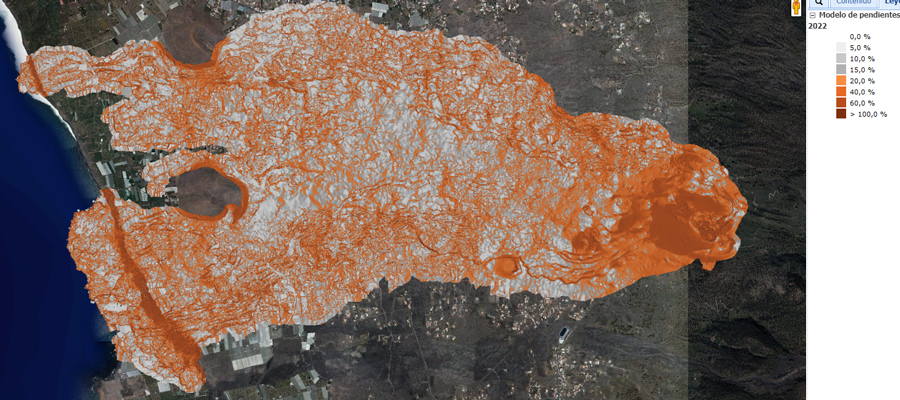 • Modelo de pendiente de la colada (Clinométrico) de 2022, realizado a partir del Modelo digital de la colada. El servicio de consulta devuelve el valor de la pendiente en % de la colada para cada punto del territorio afectado.